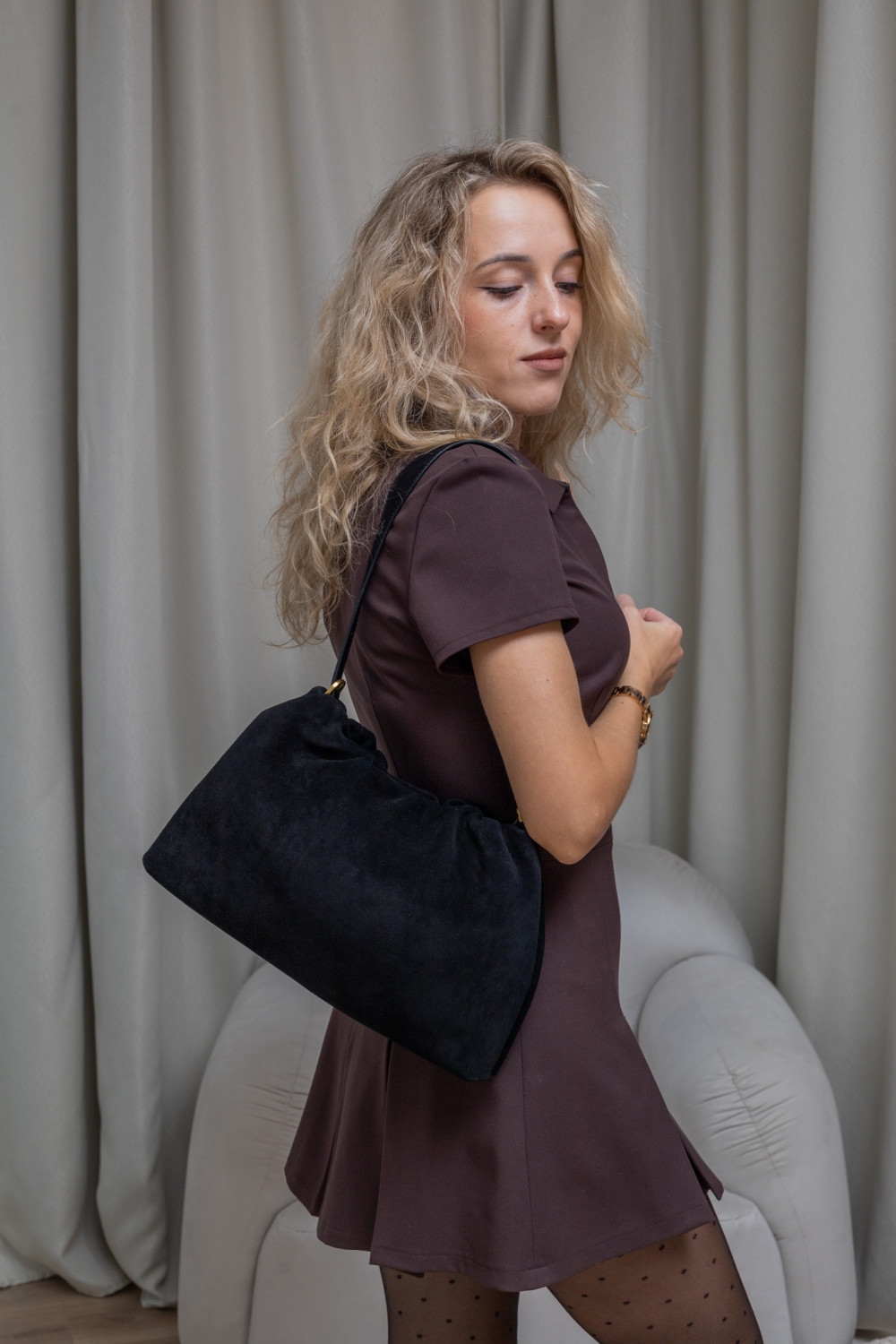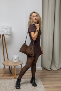Сумка трапецієвидної форми, невелика за розміром, проте достатньо містка. Усередині — якісна підкладка, одне відділення і дві кишеньки: на блискавці та вільного доступу. Зверху модель призібрана в м’які складки — це не просто дизайн, а деталь, яка надає їй елегантності і трохи кокетливості. Застібається сумочка на магнітну кнопку. Її можна носити під рукою, за середню ручку в руці, на плечі чи як кросбоді завдяки довгому шкіряному ремінцю. Дно сумочки розділене навпіл і оздоблене шкірою, щоб вона впевнено стояла на поверхнях і довго носилася.