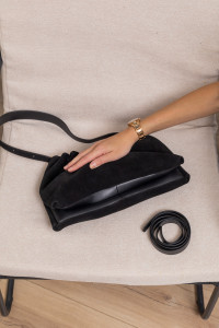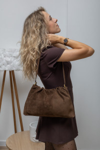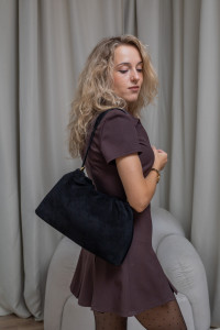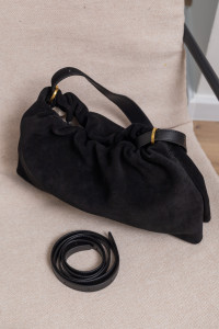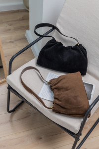 Кисет — це жіноча сумка багет з ніжними м’якими складками. Виготовлена з натуральної замші з елементами натуральної шкіри — нею зміцнене дно, ручка з тильного боку, ще є шкіряний ремінець в комплекті.