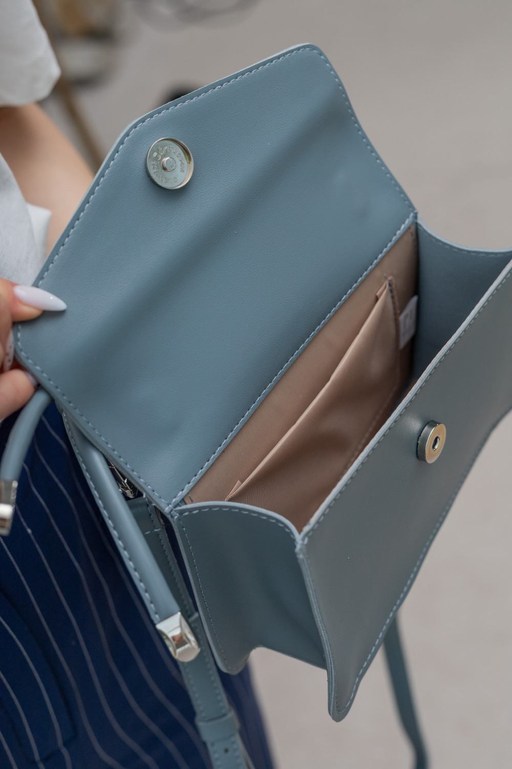 Мініатюрна сумочка Лія створена для жінок, які прагнуть підкреслити свою витонченість та індивідуальність. Виготовлена з преміальної екошкіри з міцною поліестеровою підкладкою, ця кросбоді приваблює прямокутною формою і цупкою структурою, бездоганно тримає форму та може стояти на горизонтальній поверхні. Елегантний трикутний клапан на магнітній кнопці додає нотку вишуканості, а декоративна строчка по краях підкреслює увагу до деталей. Срібляста фурнітура у вигляді кілець не лише надійно утримує компактну ручку для носіння в руці, але й кріпить знімний довгий ремінець, що легко регулюється для комфортного носіння через плече.