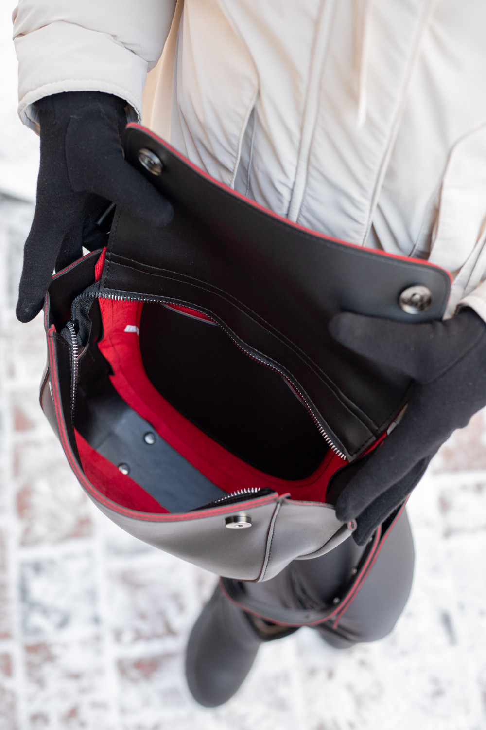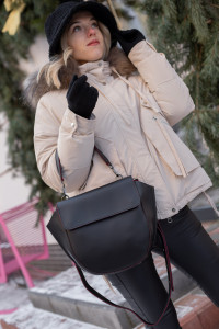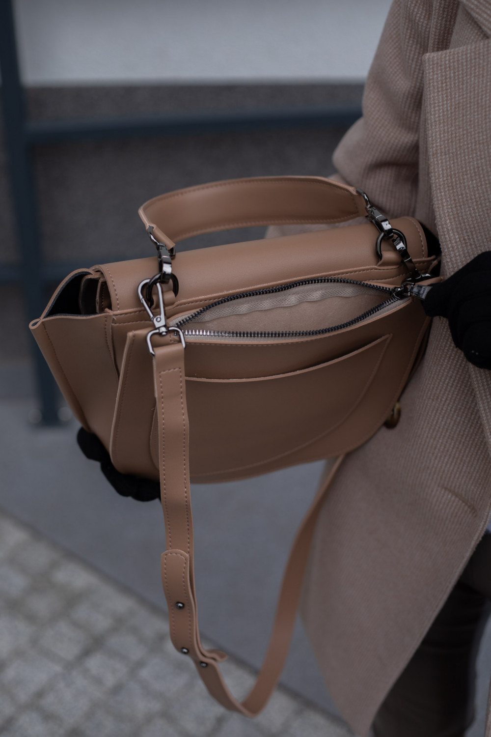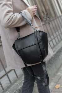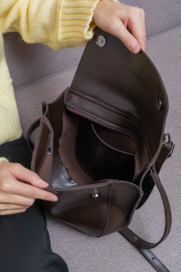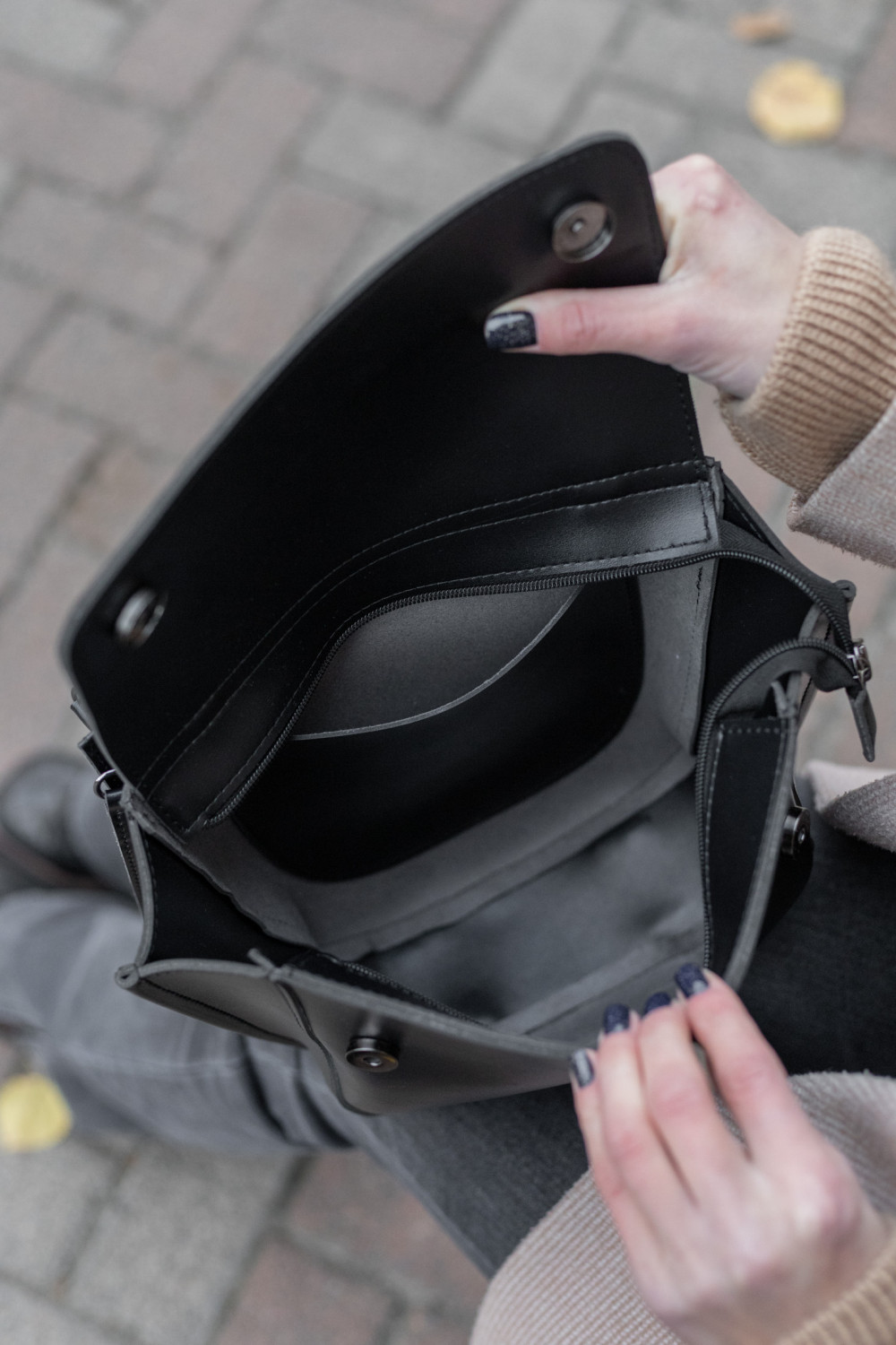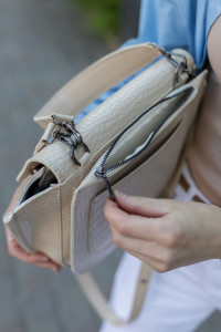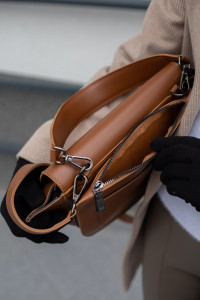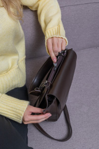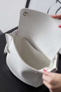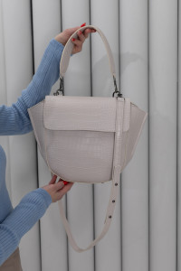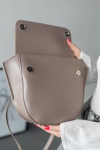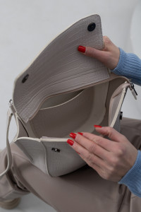 Застібка – на блискавку та клапан з двома магнітними кнопками. Сумочка без підкладки, проте з двома відділеннями та кількома кишеньками. Є також зовнішня накладна кишеня з тильного боку сумки, досить містка. Також модель має дві ручки на карабінах – довшу й коротшу, тому носити її можна в руках та на плечі.