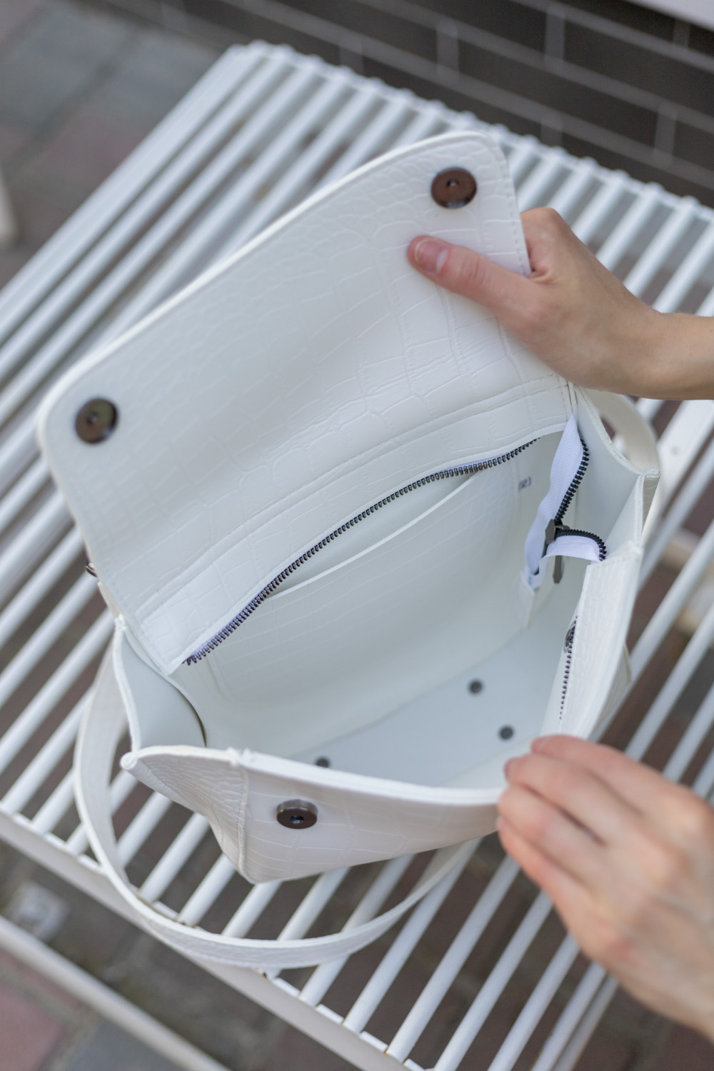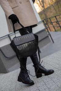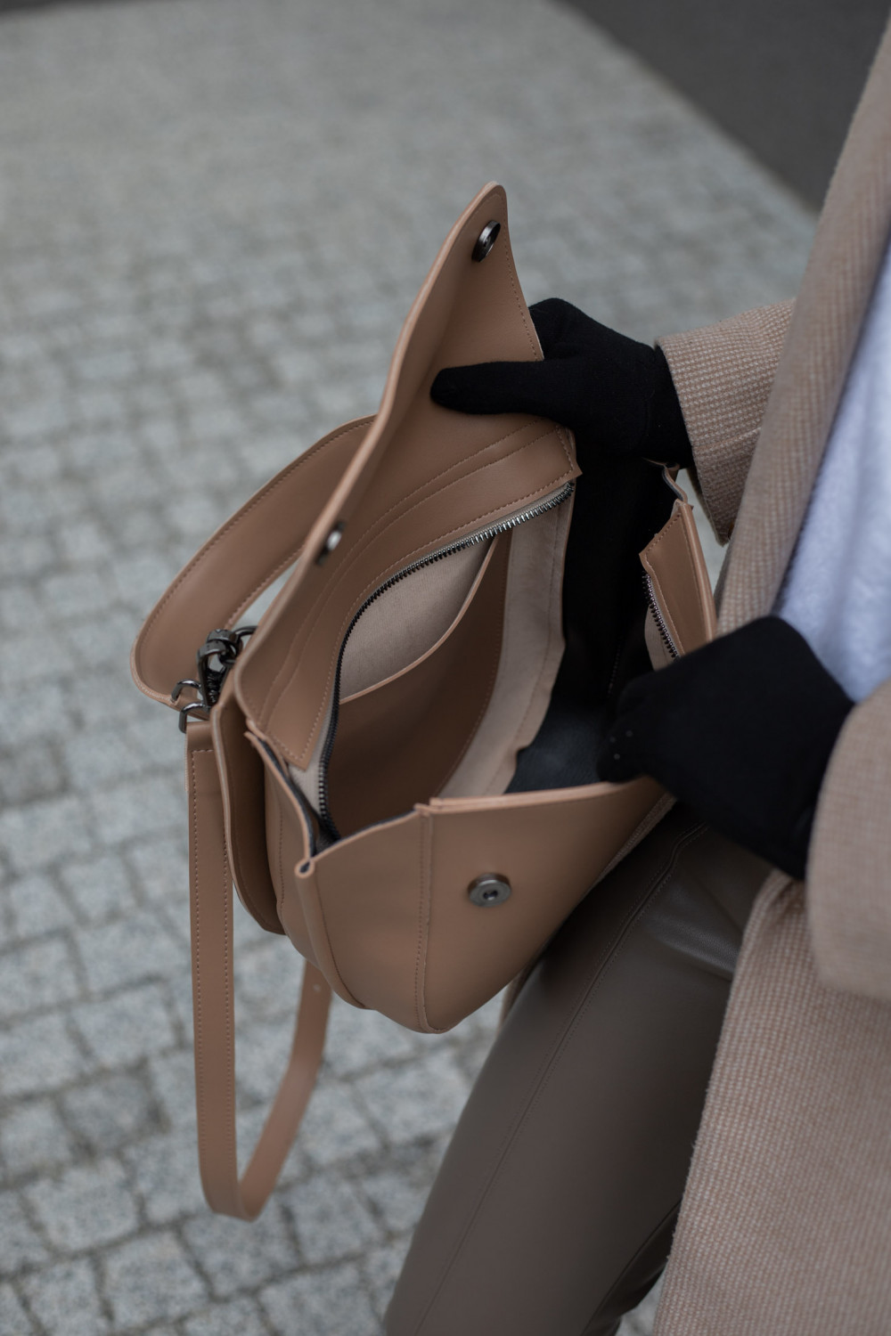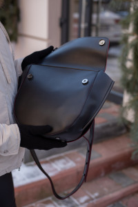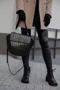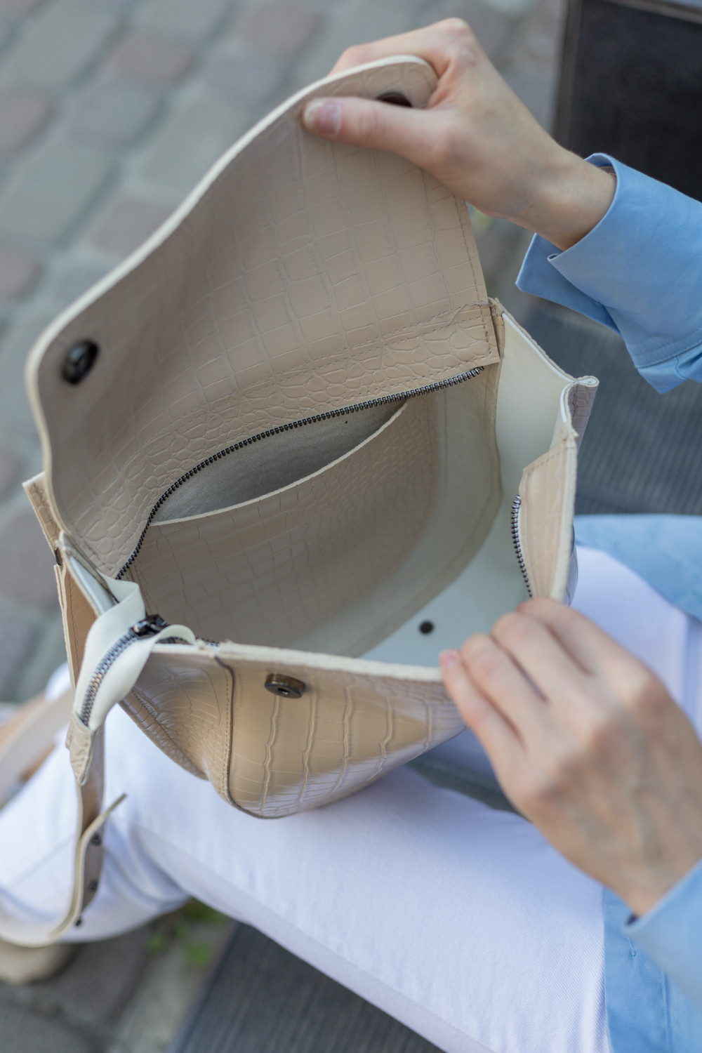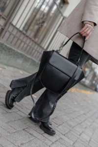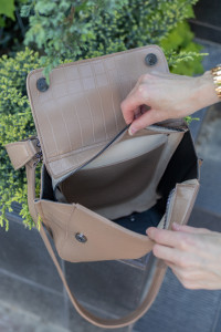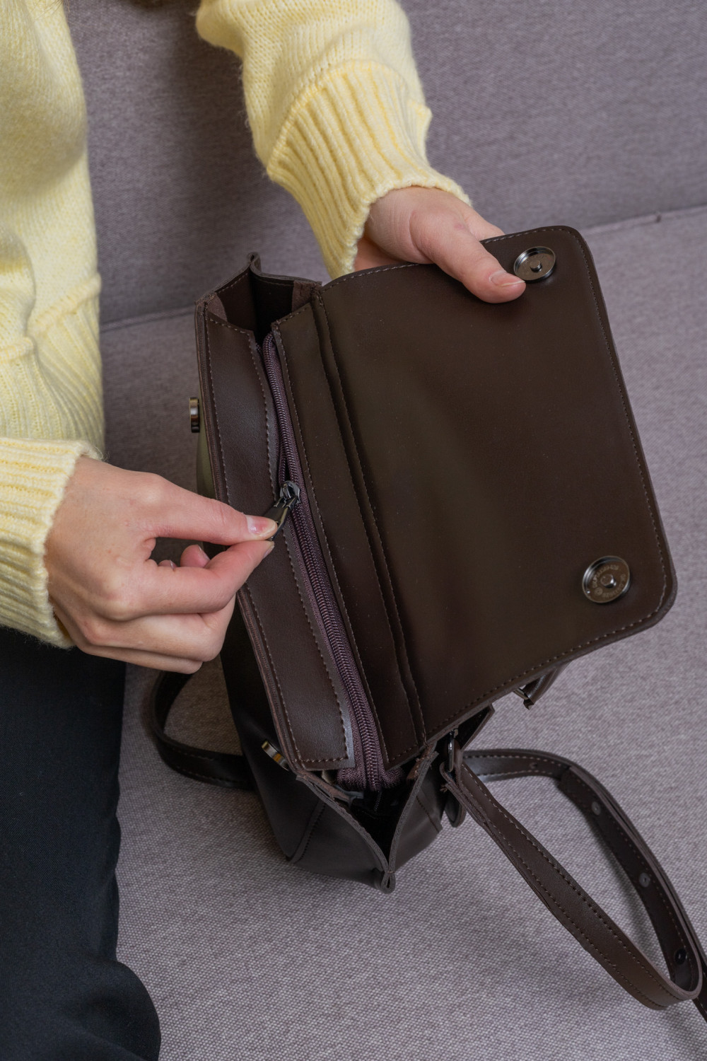 Застібка – на блискавку та клапан з двома магнітними кнопками. Сумочка без підкладки, проте з двома відділеннями та кількома кишеньками. Є також зовнішня накладна кишеня з тильного боку сумки, досить містка. Також модель має дві ручки на карабінах – довшу й коротшу, тому носити її можна в руках та на плечі.