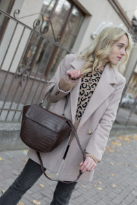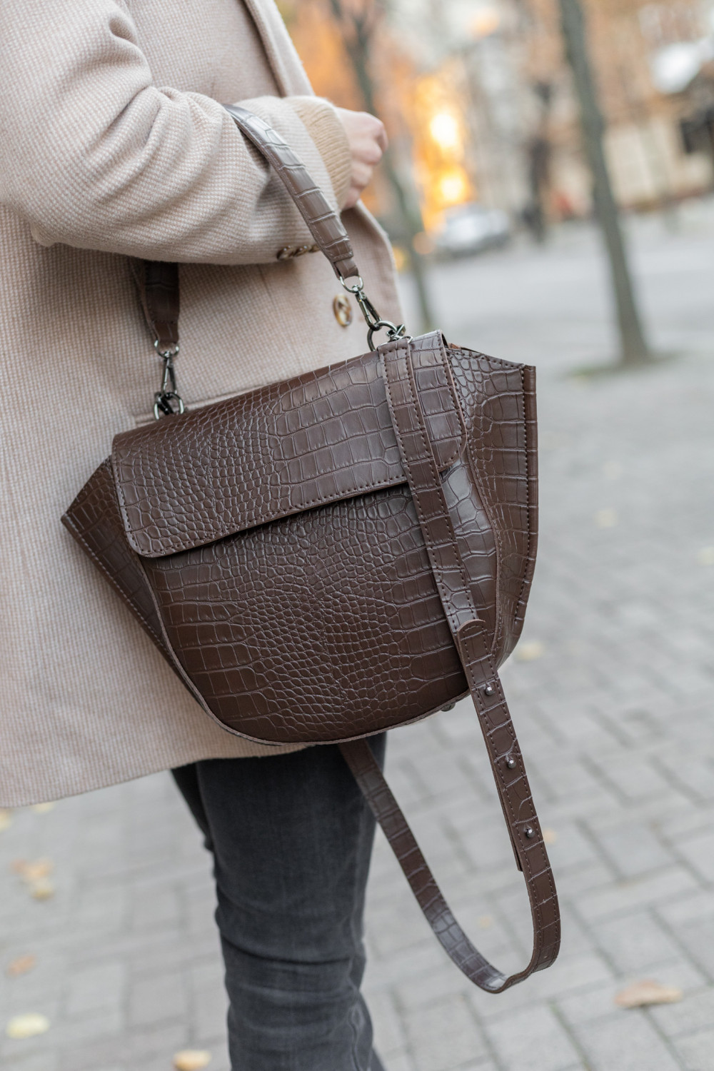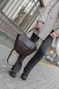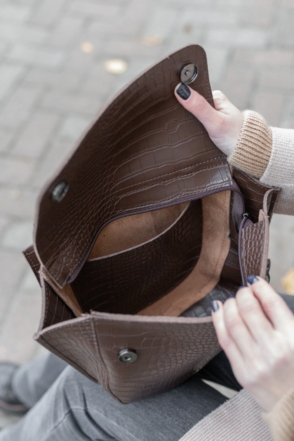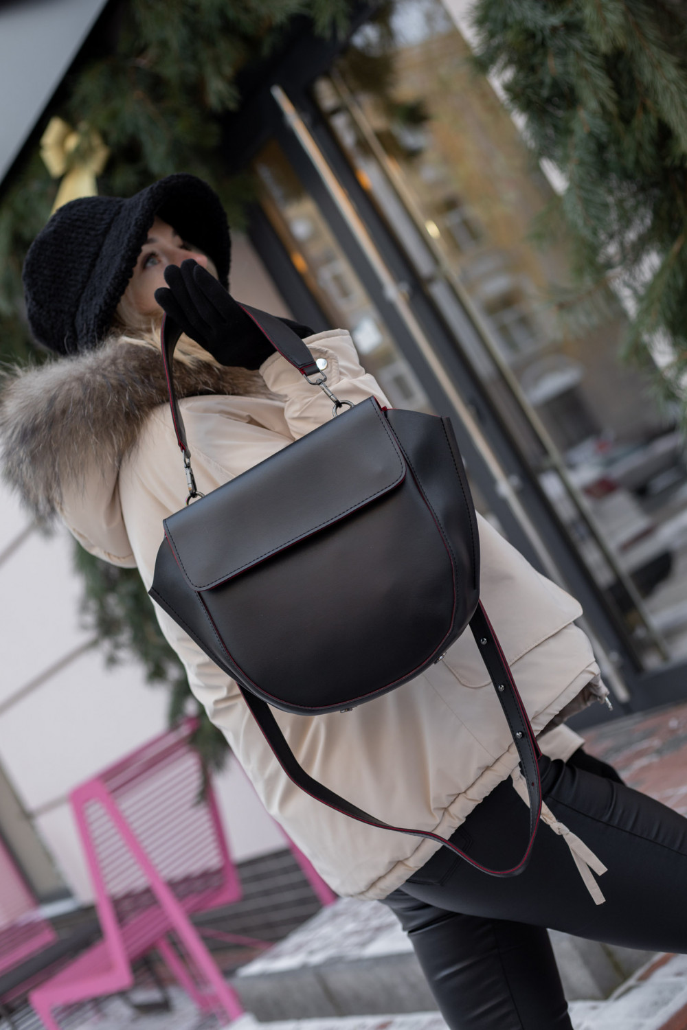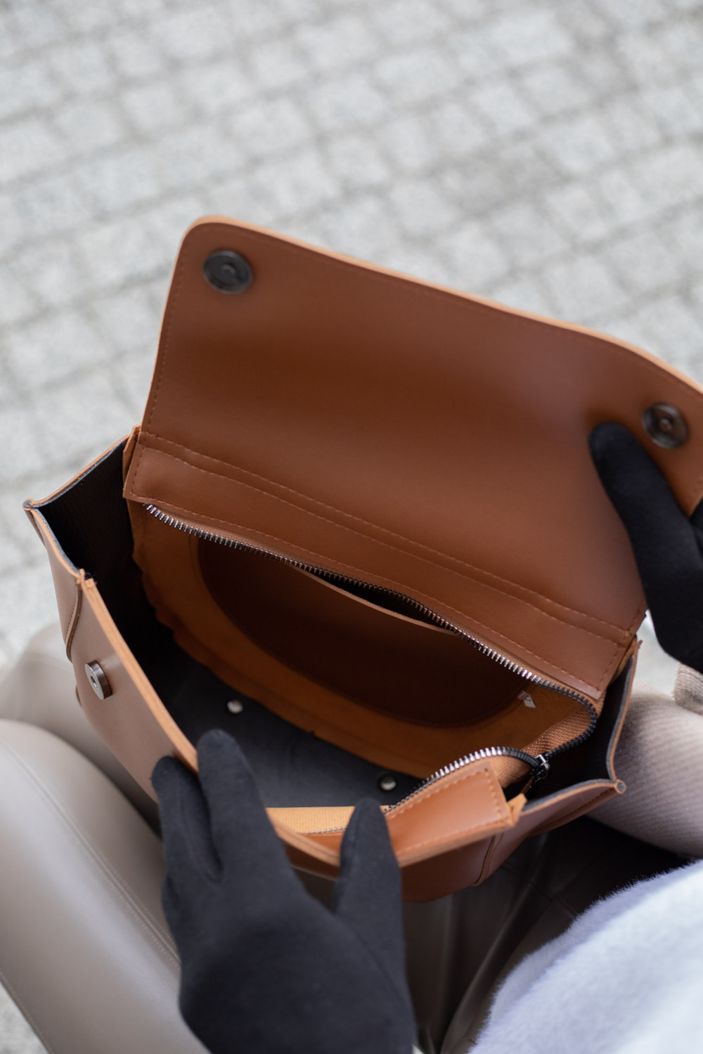 Застібка – на блискавку та клапан з двома магнітними кнопками. Сумочка без підкладки, проте з двома відділеннями та кількома кишеньками. Є також зовнішня накладна кишеня з тильного боку сумки, досить містка. Також модель має дві ручки на карабінах – довшу й коротшу, тому носити її можна в руках та на плечі.
