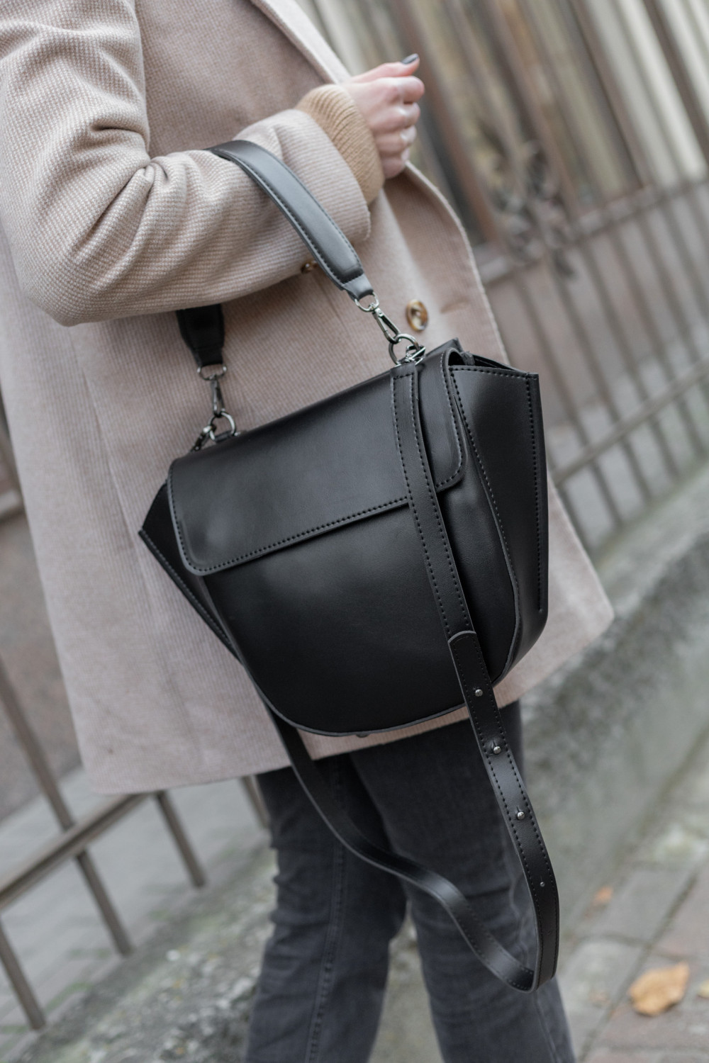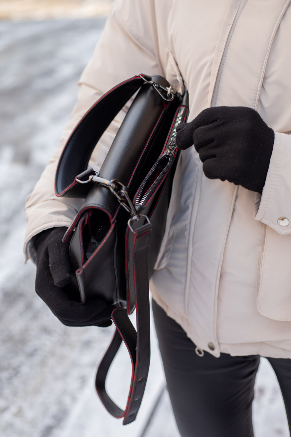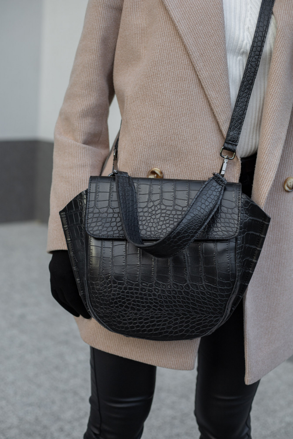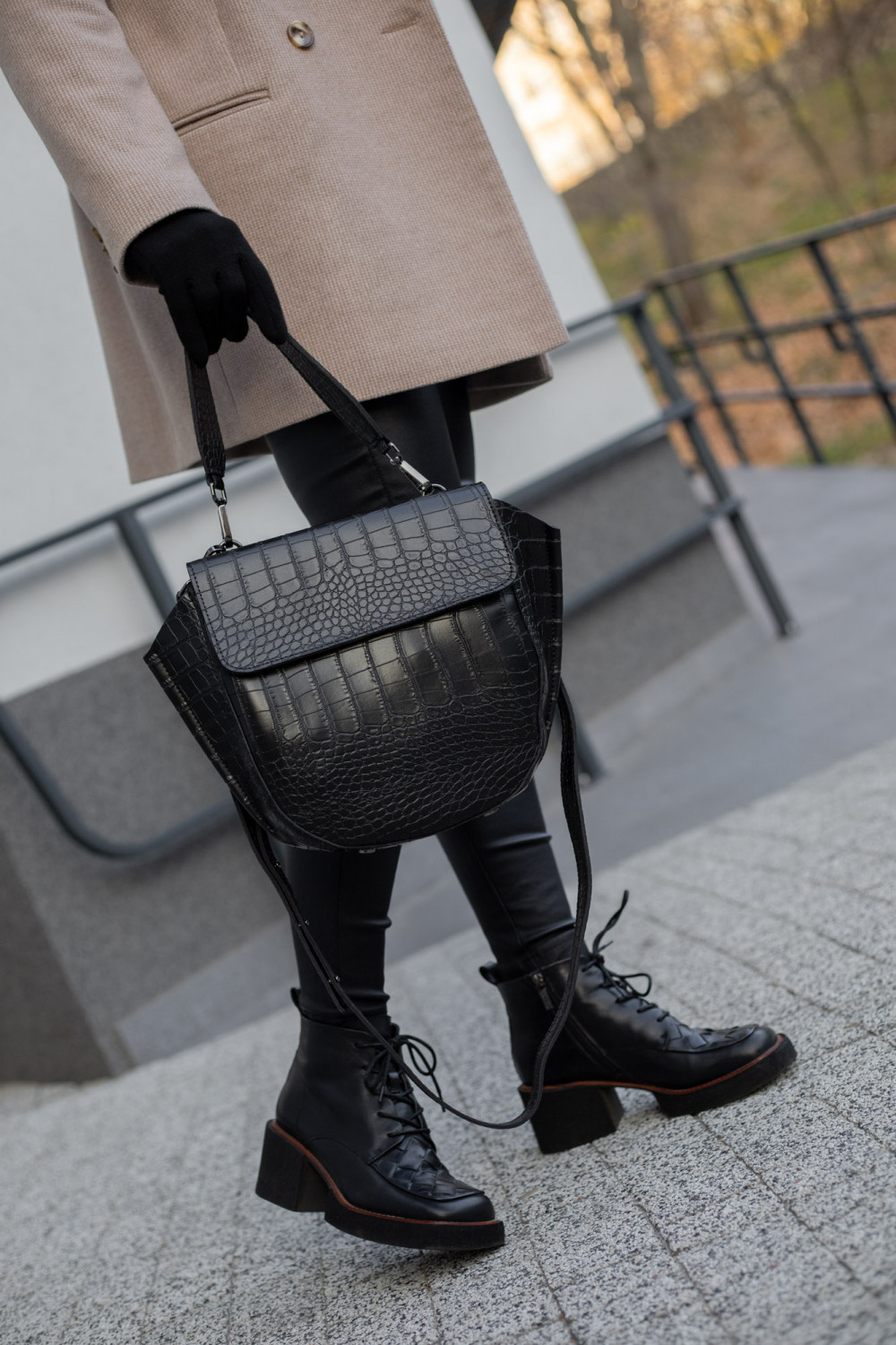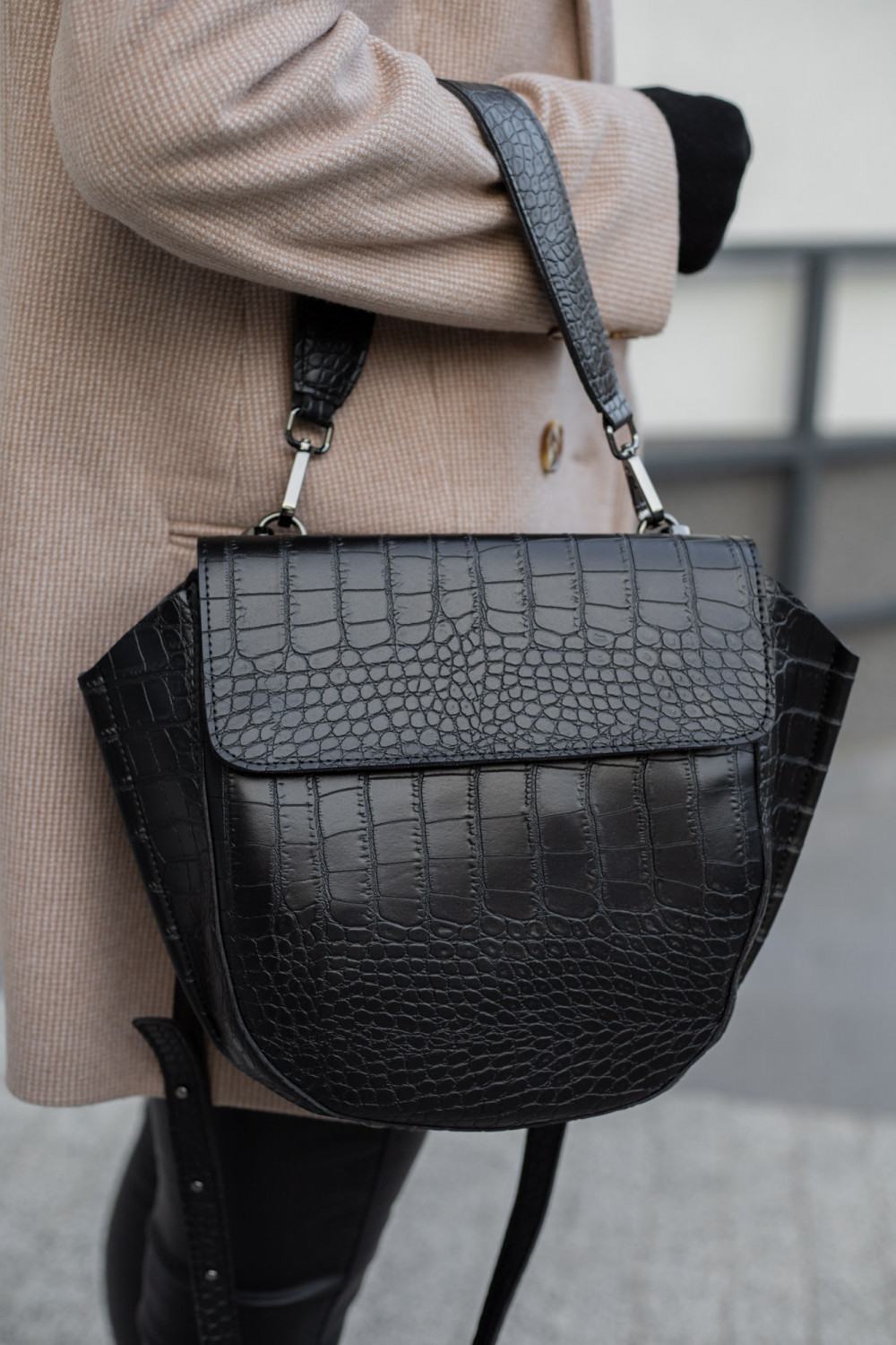 Чорна жіноча сумочка з текстурою кроко та клапаном в руці дівчини фото