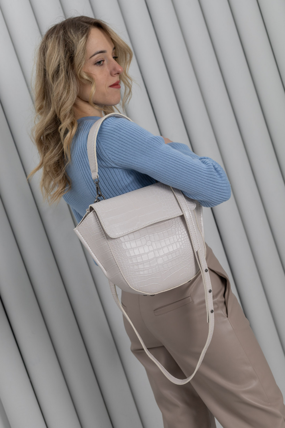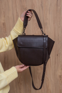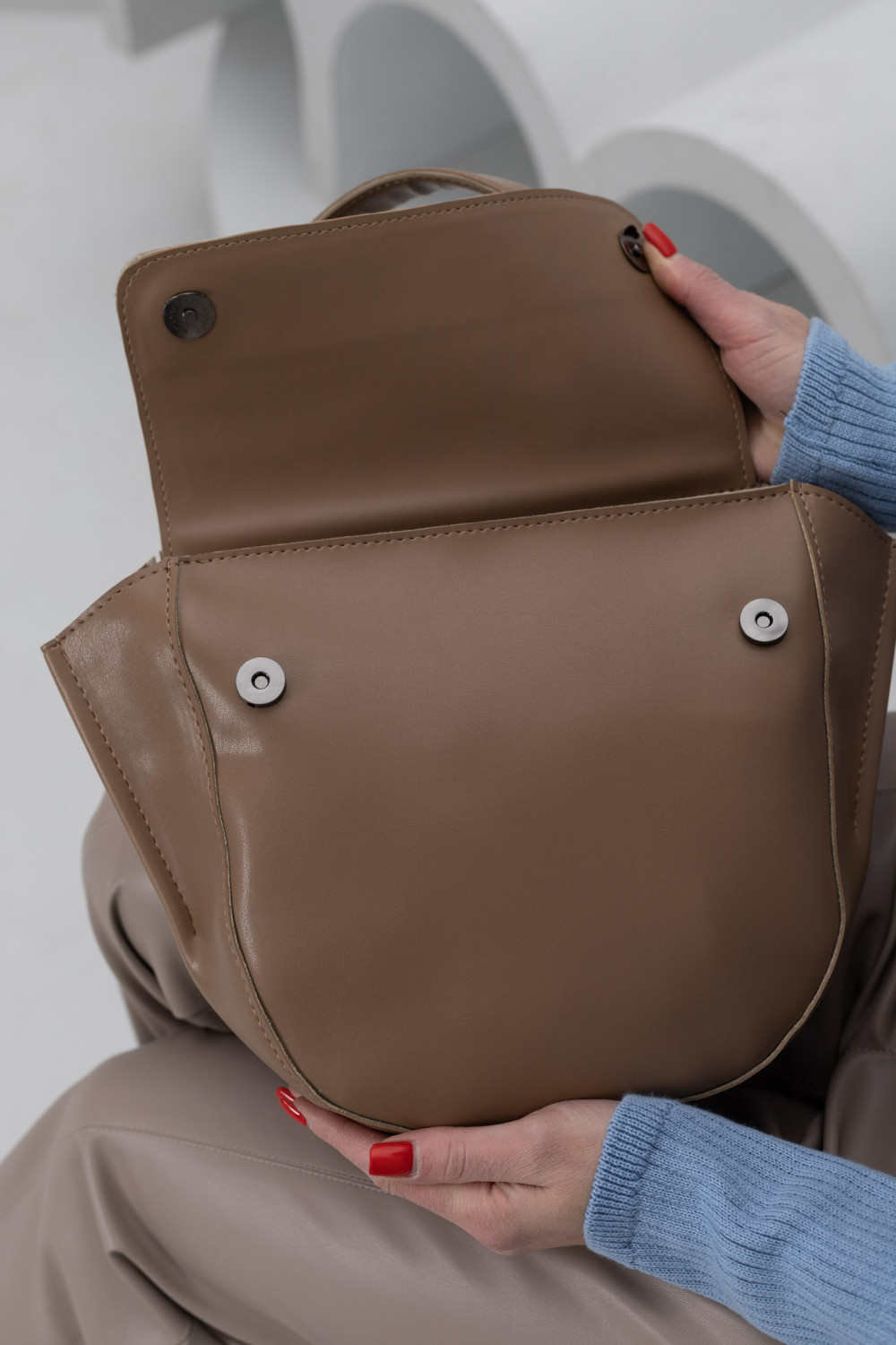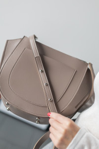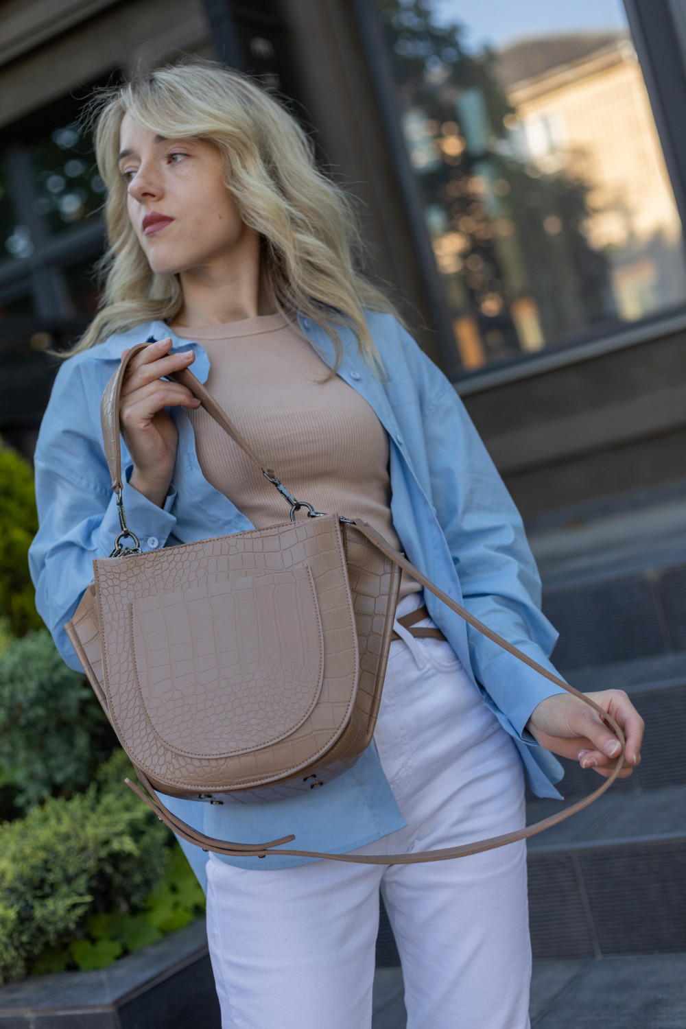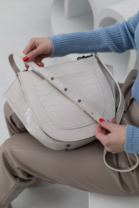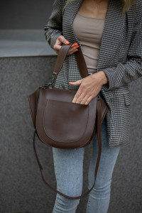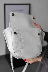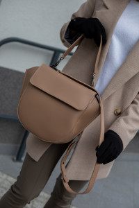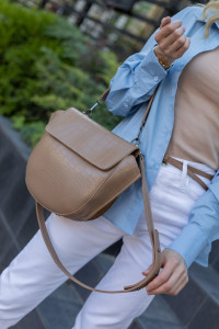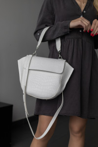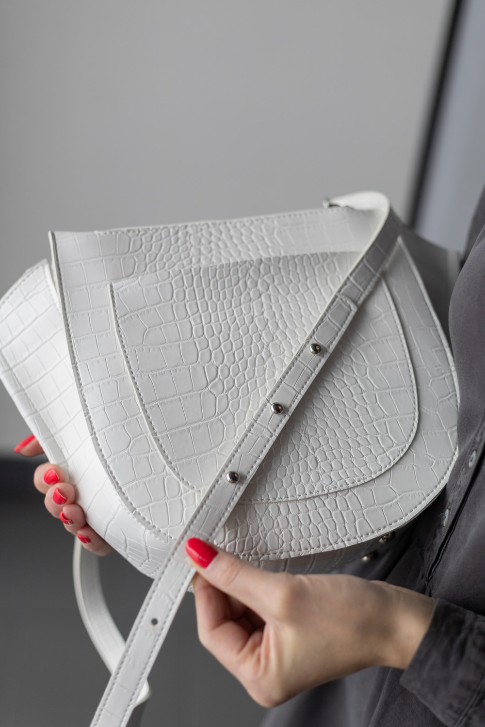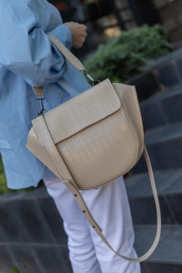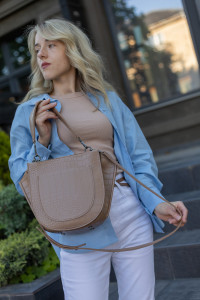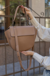 Жіноча сумка Садел виготовлена з якісної екошкіри, представлена у двох видах текстур – гладенькій та кроко. В асортименті – теплі природні кольори, а також білий і чорний. Сумка оригінальної напівкруглої форми, з бічними вставками, виглядає стильно й привабливо. Разом з тим, мінімалістичний дизайн, без зайвих елементів декору, робить її універсальною - для різних призначень.