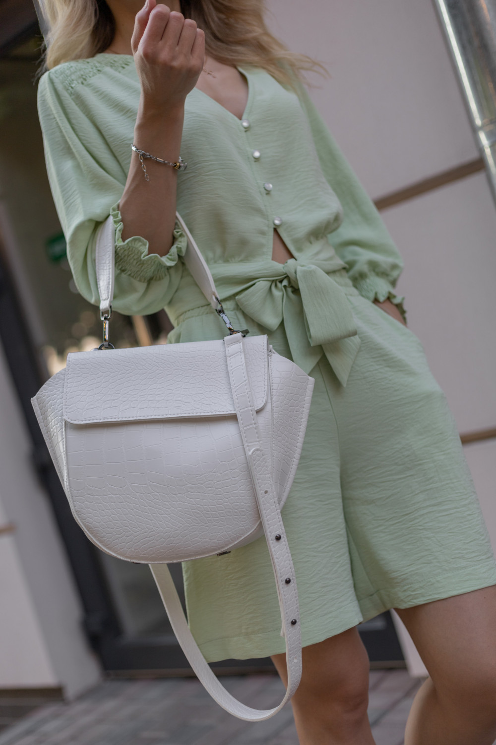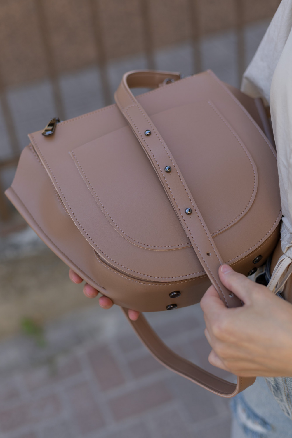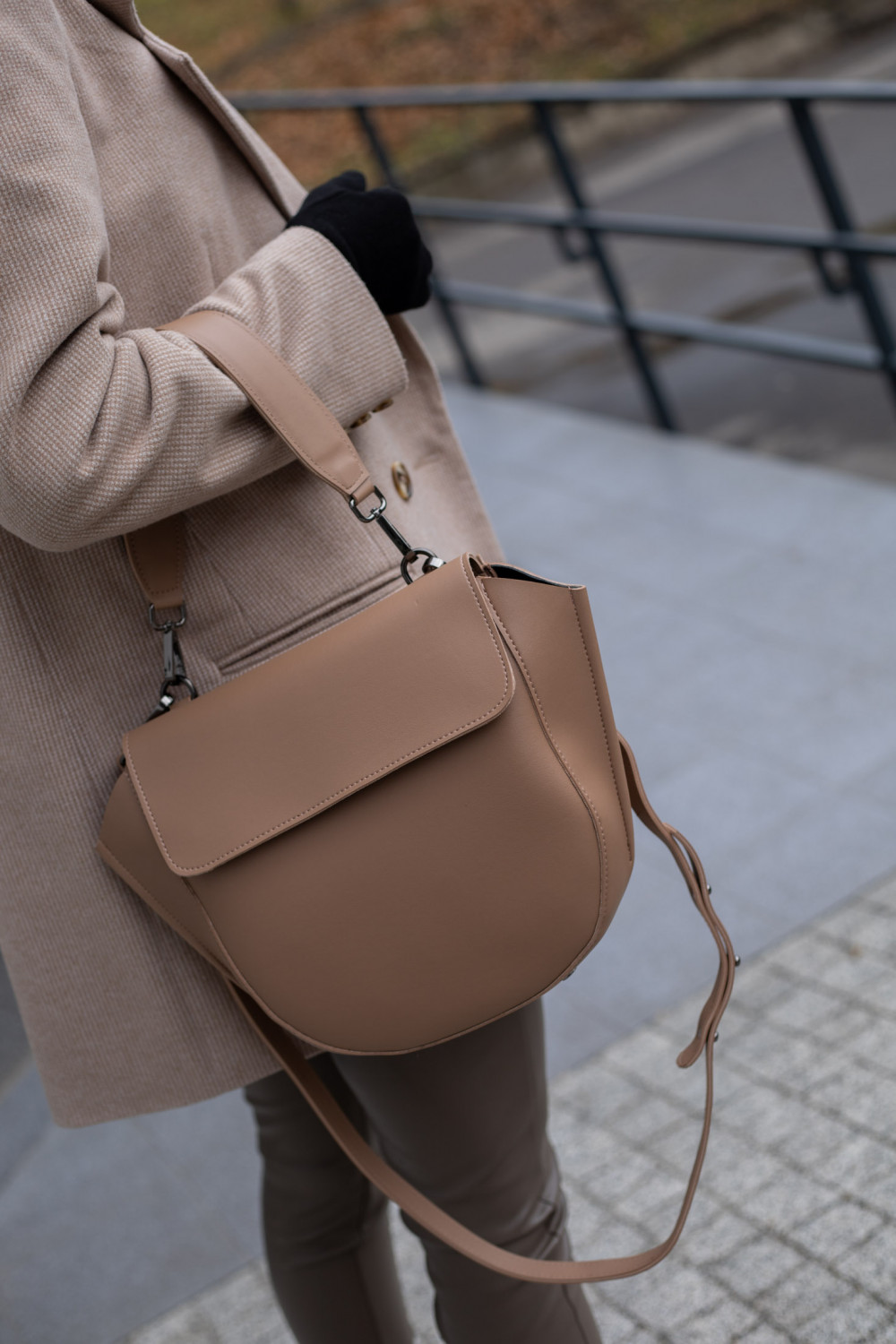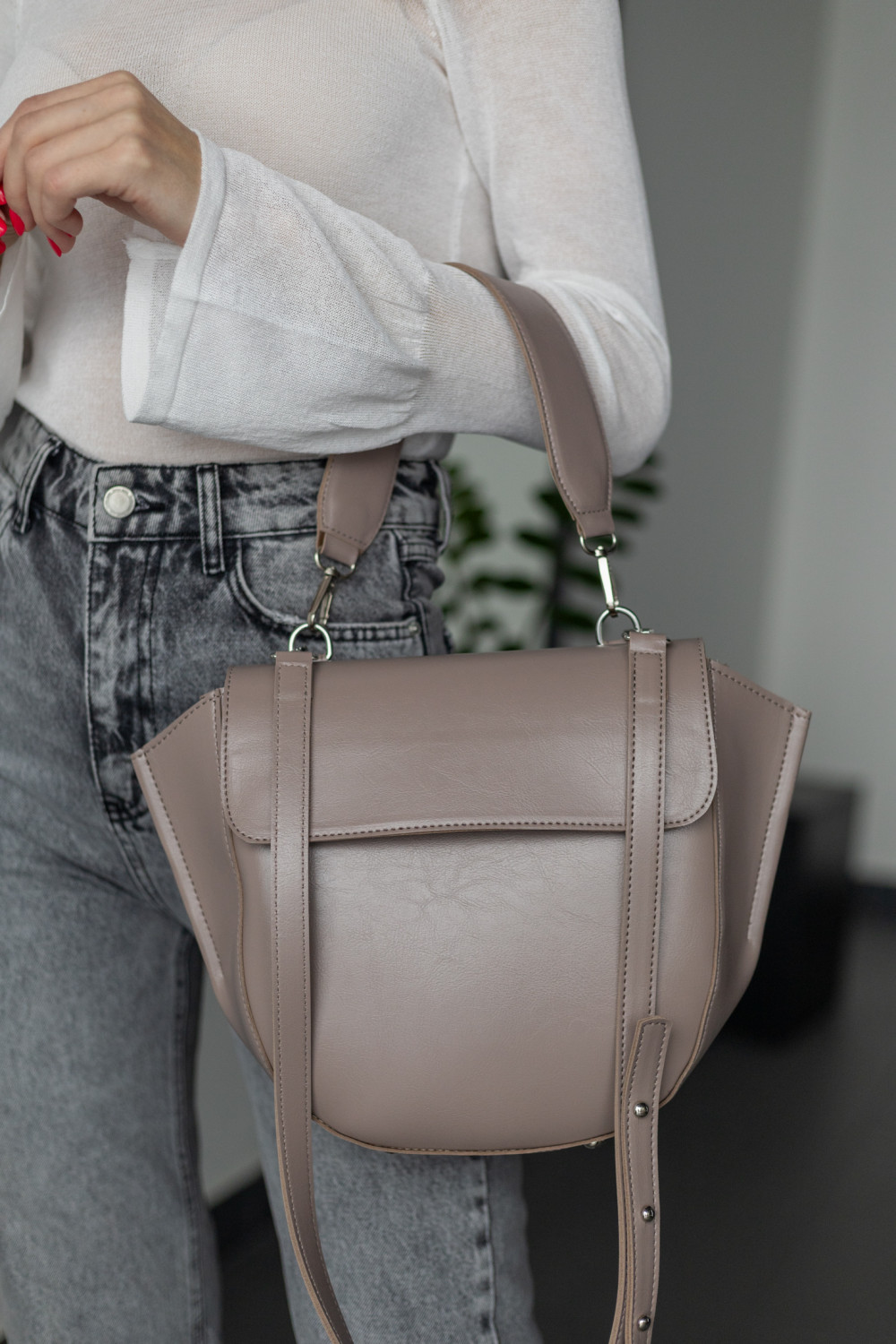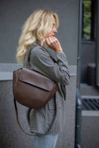 Жіноча сумка Садел виготовлена з якісної екошкіри, представлена у двох видах текстур – гладенькій та кроко. В асортименті – теплі природні кольори, а також білий і чорний. Сумка оригінальної напівкруглої форми, з бічними вставками, виглядає стильно й привабливо. Разом з тим, мінімалістичний дизайн, без зайвих елементів декору, робить її універсальною - для різних призначень.