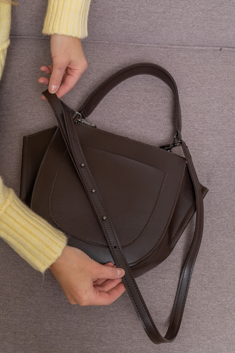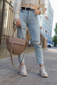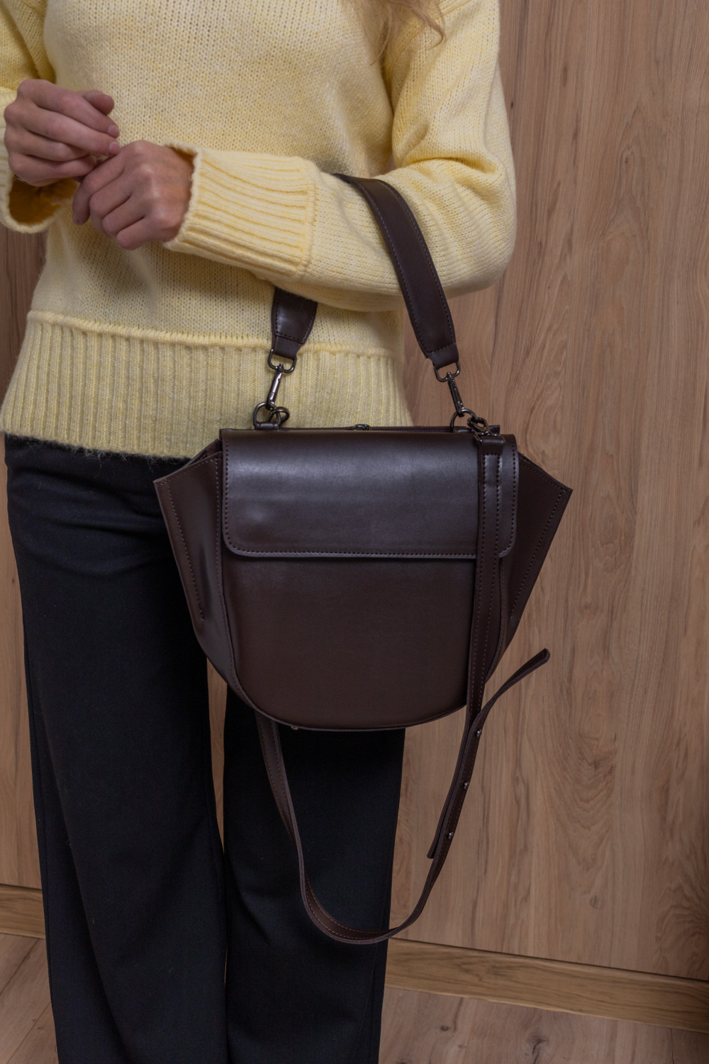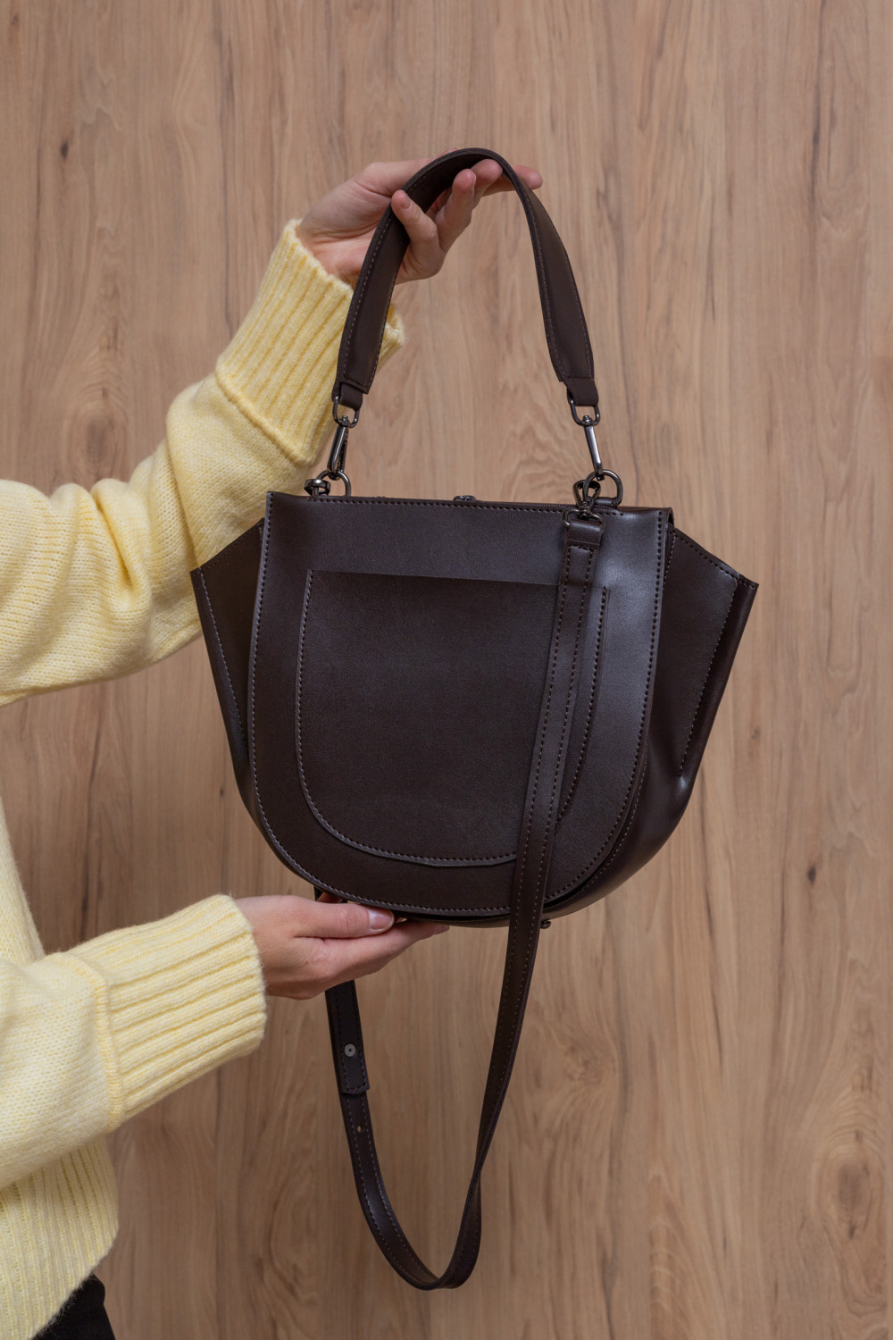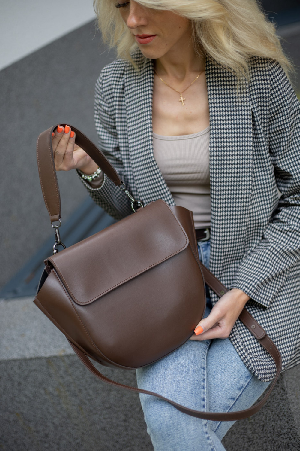 Жіноча сумка Садел виготовлена з якісної екошкіри, представлена у двох видах текстур – гладенькій та кроко. В асортименті – теплі природні кольори, а також білий і чорний. Сумка оригінальної напівкруглої форми, з бічними вставками, виглядає стильно й привабливо. Разом з тим, мінімалістичний дизайн, без зайвих елементів декору, робить її універсальною - для різних призначень.
