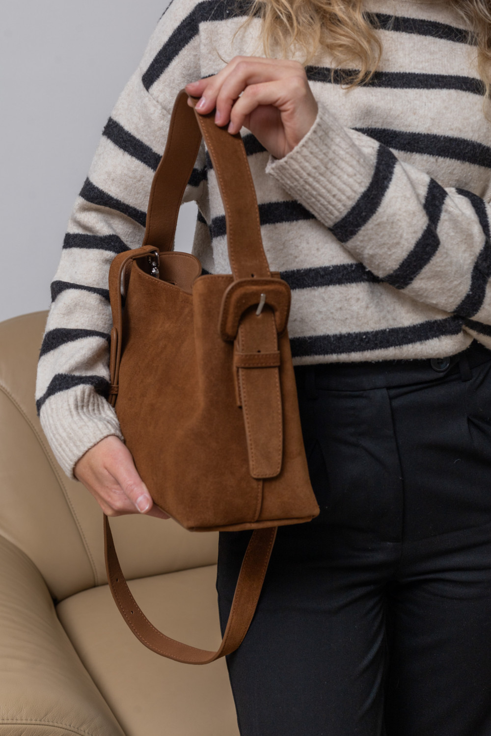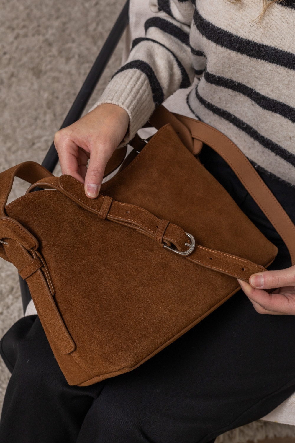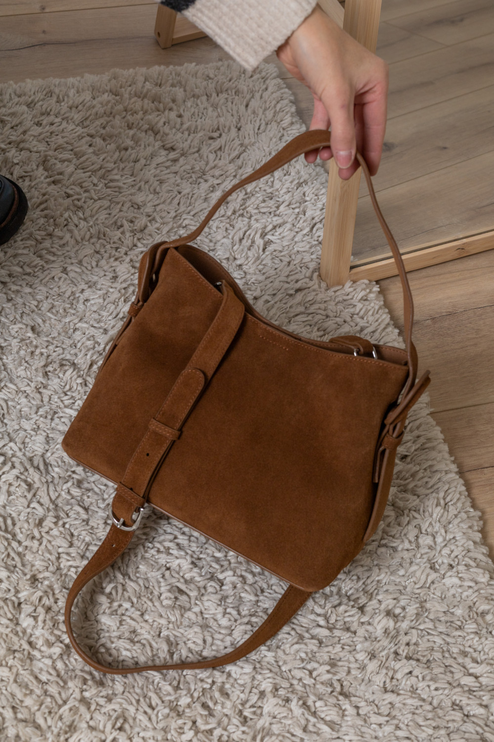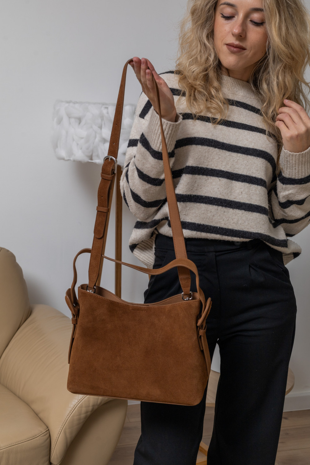 Форма — м’який, трохи розслаблений прямокутник. Не гострі кути, не надмірна чіткість. Коротка широка ручка на замшевих пряжках — це коли хочеться нести її в руці і почуватися трохи королевою. А довгий регульований ремінець — це коли королева поспішає на каву чи на ділову зустріч.