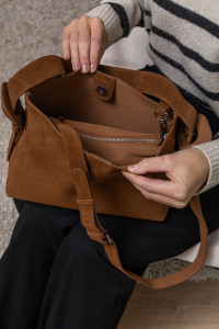Знайомтеся — Теракота. Тепла, як глиняний горщик на бабусиному підвіконні, і така ж надійна. Сумка кросбоді з натуральної замші кольору кераміки створена для тих, хто любить, коли все під рукою, проте виглядає так, ніби щойно зійшла з обкладинки журналу.